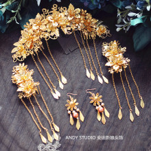 金色流苏古装新娘头饰套装发梳步摇凤冠结婚中式秀禾服龙凤褂发饰