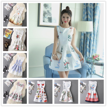 2017夏新款时尚提花印花收腰显瘦蓬蓬A字裙修身打底无袖连衣裙女
