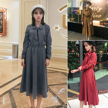 韩版2017春装新品女装宽松显瘦灯芯绒系带肩章连衣裙女士气质长裙