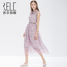 香衣丽橱2017夏装新款 中长款气质无袖收腰雪纺印花连衣裙女长裙