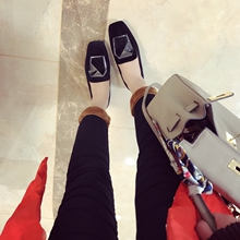 方扣单鞋女平底2017春季新款韩版绒面黑色百搭方头平底鞋乐福鞋女