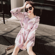 2017春夏欧美复古V领雪纺短裙高腰七分袖系带荷叶边大码连衣裙子