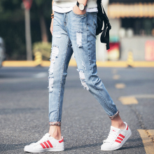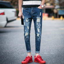 韩版潮流破洞九分牛仔裤男士夏季新款2017修身青少年薄款小脚裤子