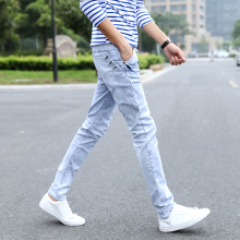 夏季抽绳牛仔裤男士韩版修身小脚磨白铅笔裤青少年潮流弹力裤子男