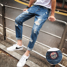 2017夏季新款韩版修身小脚裤潮流休闲乞丐裤男水洗破洞牛仔九分裤