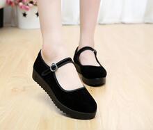 职业防水台女松糕工作平跟坡跟酒店浅口圆头黑色低帮厚底一带布鞋
