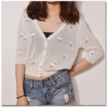 白天鹅刺绣真丝拼接天丝亚麻中袖针织开衫 女式超薄半透明防晒衫