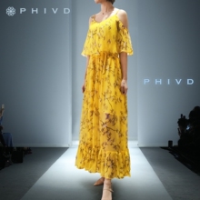 Phivd/菲雯迪真丝印花连衣裙夏装2017新款V领荷叶边露肩黄色长裙