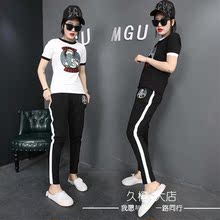 2017春季新款韩版金丝绒运动套装女亮片花旦显瘦半袖长裤两件套潮