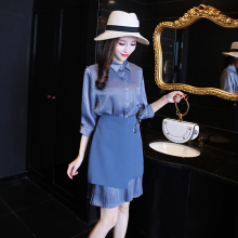 春装新款韩版娃娃领百褶衬衫连衣裙+不规则包臀半身裙时尚套装T31