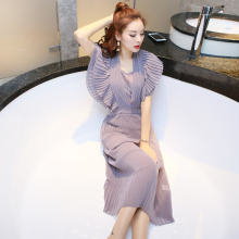 2017新款名媛气质无袖连衣裙女百褶皱裙子吊带两件套修身显瘦潮