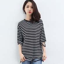 春夏新款中袖T恤女大码 夏季休闲上衣宽松黑白条纹纯棉打底衫短袖