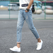 2017春季青少年韩版修身破洞九分牛仔裤男小脚裤休闲直筒长裤子潮
