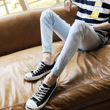 2016秋冬季日系破洞牛仔裤九分裤男士韩版潮流乞丐裤紧身小脚9分