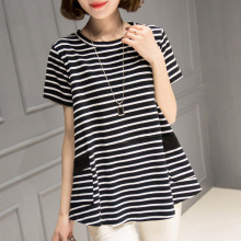 刺绣条纹t恤女短袖2017夏新款韩版宽松百搭大码体恤衫中长款胖mm