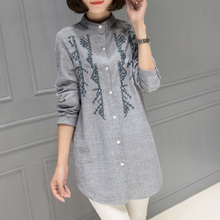 棉麻条纹衬衫女长袖中长款2017春装新款宽松衬衫裙韩版刺绣衬衣