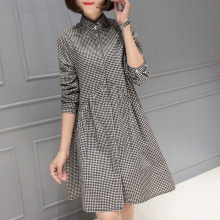 棉麻衬衫裙女中长款韩版立领黑白复古小格子衬衣长袖修身上衣