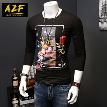 欧洲站男士长袖t恤 秋装修身印花体恤打底衫圆领潮男装衣服上衣t