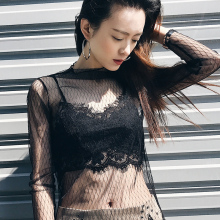 2017春装渔网透视网纱内搭蕾丝打底衫女长袖性感网状镂空网格上衣