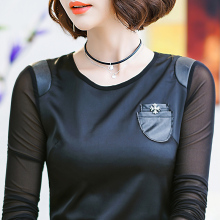 慕吻有约春秋装网纱拼皮烫钻修身韩版打底衫女长袖长款V领T恤小衫