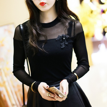 网纱打底衫女长袖 圆领胸花拼接性感上衣纯色百搭修身显瘦大码T恤