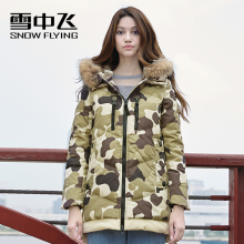 雪中飞2017秋冬新款女士迷彩连帽带毛领中长款加厚羽绒服X1401078