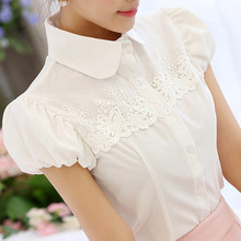夏季韩版小清新娃娃领蕾丝短袖衬衫女 学院风修身白色雪纺衫衬衣