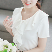 夏季新款韩范女装V领荷叶边衬衫女短袖雪纺衫白衬衣修身学生上衣