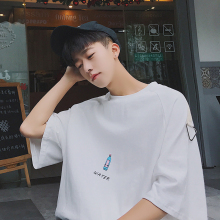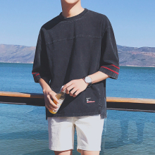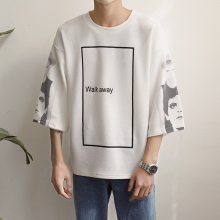 日系印花男士宽松圆领落肩七分袖T恤简约青少年夏季潮半袖体恤衫