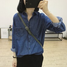 大萌家。韩国单 太正! 复古宽松水洗做旧牛仔口袋休闲长袖衬衫女
