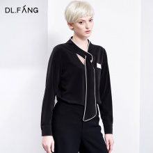 达丽坊2017春款新品欧美个性黑色拼色绑带领设计师雪纺衬衫女宽松