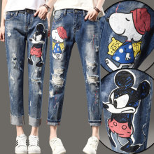 2017春季新款破洞米奇卡通宽松印花休闲大码九分牛仔裤女学院翻边
