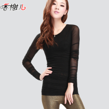 香榭儿2017春秋新款网纱打底衫女 百搭黑色打底衫长袖t恤薄款纱衣