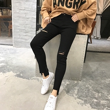 韩版春装新款中低腰破洞修身显瘦弹力棉布裤脚缺口小脚黑色打底裤