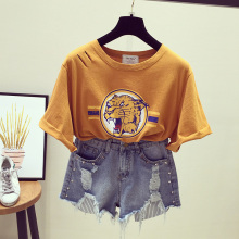 短袖t恤女夏装2017新款韩版宽松印花圆领半袖体恤百搭破洞上衣潮