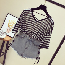 条纹t恤女夏季2017新款韩版宽松露背五分袖冰丝针织微透心机上衣
