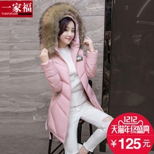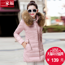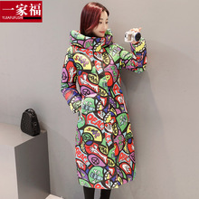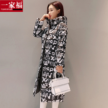 一家福2016冬新款连帽棉衣女中长款韩版修身印花棉服时尚棉袄外套