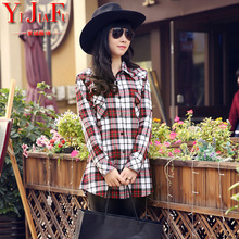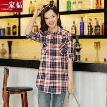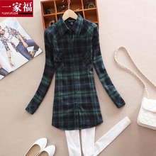 2016春秋格子衬衫女中长款韩版修身时尚百搭纯棉磨毛打底衬衣上衣