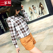 2017春秋短款格子长袖衬衫女韩版修身时尚百搭纯棉磨毛打底上衣潮