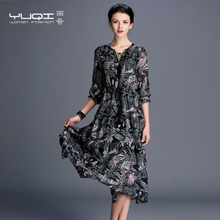 雨奇2017新款真丝连衣裙宽松大码印花蚕丝连衣裙中长款复古连衣裙