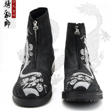 骑豹郎高帮鞋男反绒皮工装鞋中国风龙纹绣花民族风复古套筒男鞋子