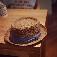 海豚家拉菲草平顶卷边短檐牛仔蝴蝶结草帽女士春夏休闲日韩系帽子