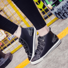 韩版秋季帆布鞋女高帮魔术贴女休闲鞋黑色帆布鞋女高帮鞋皮面板鞋