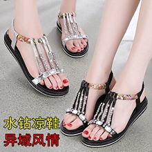 波西米亚凉鞋女夏2017新款坡跟真皮水钻平底百搭简约软底沙滩凉鞋