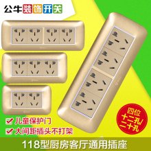 公牛开关插座面板118型四位大盒12孔20孔香槟金色十二孔厨房插座