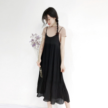 韩风甜美学院风纯色百褶拼接中长款吊带裙/连衣裙/裙子 女2色包邮