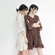 韩风春季清新款松紧一字领喇叭袖碎花雪纺连衣裙/裙子 女2色包邮