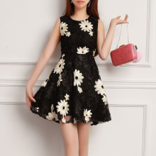 2017春夏新款 韩版淑女立体花朵刺绣收腰显瘦不规则无袖连衣裙子
