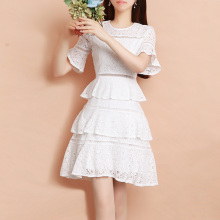2017夏装新款甜美淑女绣花收腰雪纺荷叶摆白色短袖蕾丝连衣裙仙女