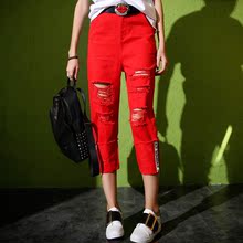 原点范欧洲站2017春季新款破洞牛仔裤子女宽松哈伦裤九分裤潮0119